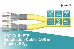 DK-1745-A-VH-D-5 DIGITUS Professional Cat.7A S-FTP Twisted Pair Duplex-Datenkabel Dca, 1.500 MHz, 500m Trommel, B2ca (EN 50575), blanker Kupferdraht AWG 22/1, farbcodiert, 100% Abschirmung der Einzelpaare, Farbe:gelb Außendurchmesser: 7,5 mm